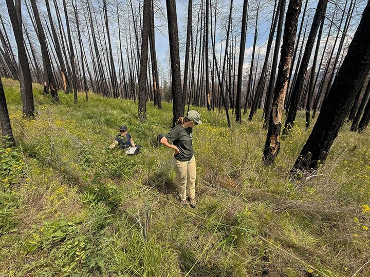 In summer 2025, field research activities focused on remeasuring vegetation regeneration following the 2021 wildfire. Prior to 2021, this area had not burned for over 100 years, and the pre-fire forests were dense and heavy with fuel. The 2021 wildfire burned intensely and together with the SXFN, researchers wondered how the vegetation would recover following such a severe wildfire. In 2023, researchers assessed burn severity at 30 plots and collected the first set of vegetation information, and then in 2025 they returned to remeasure vegetation at these same plots. At each plot, researchers identified all the plant species present and then estimated the area covered by each species in a defined area (plot). Researchers will revisit each of these plots every 2-3 years until 2045 to monitor post fire recovery.